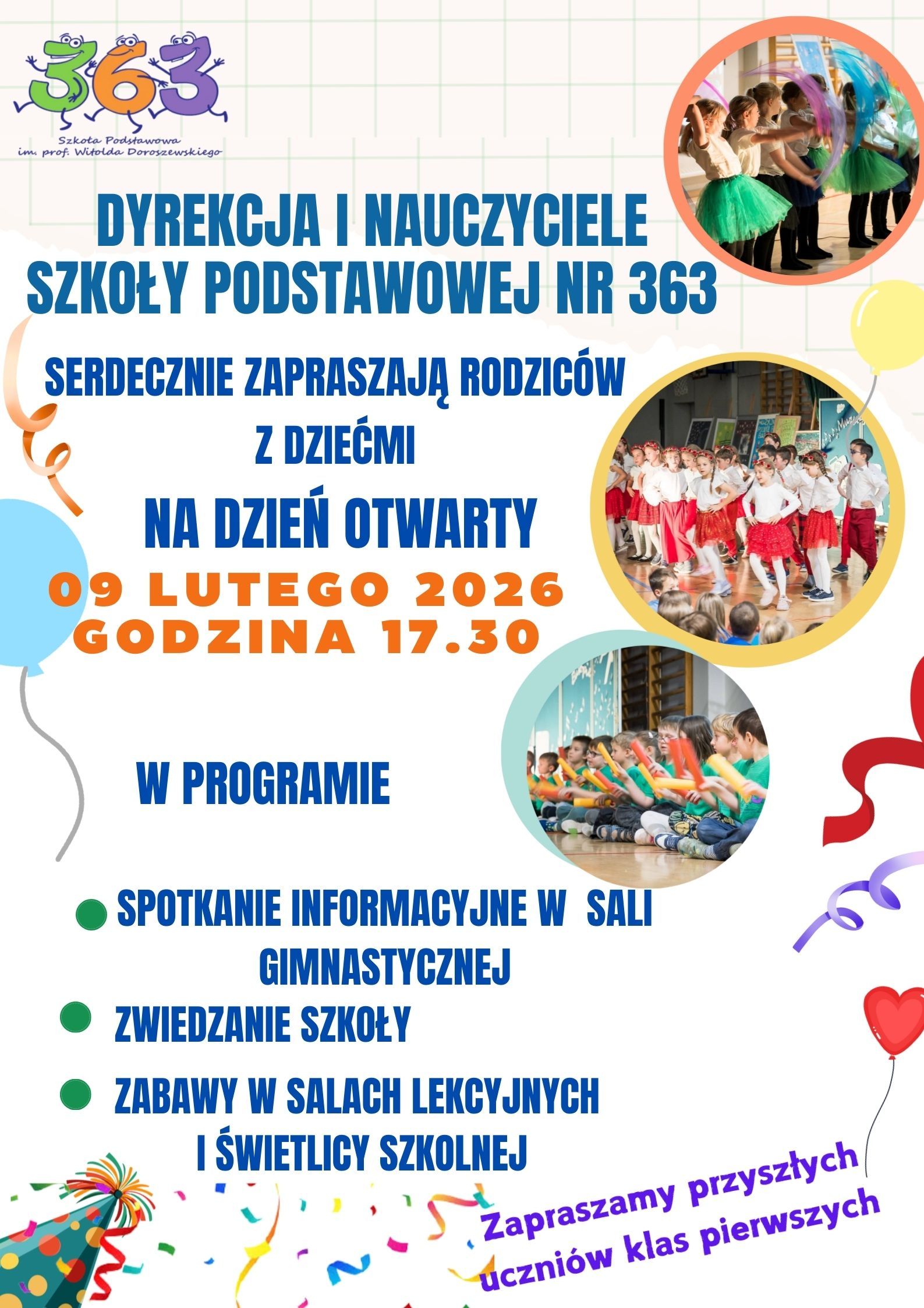 Dyrekcja oraz nauczyciele Szkoły Podstawowej nr 363 serdecznie zapraszają rodziców wraz z dziećmi na Dzień Otwarty, który odbędzie się