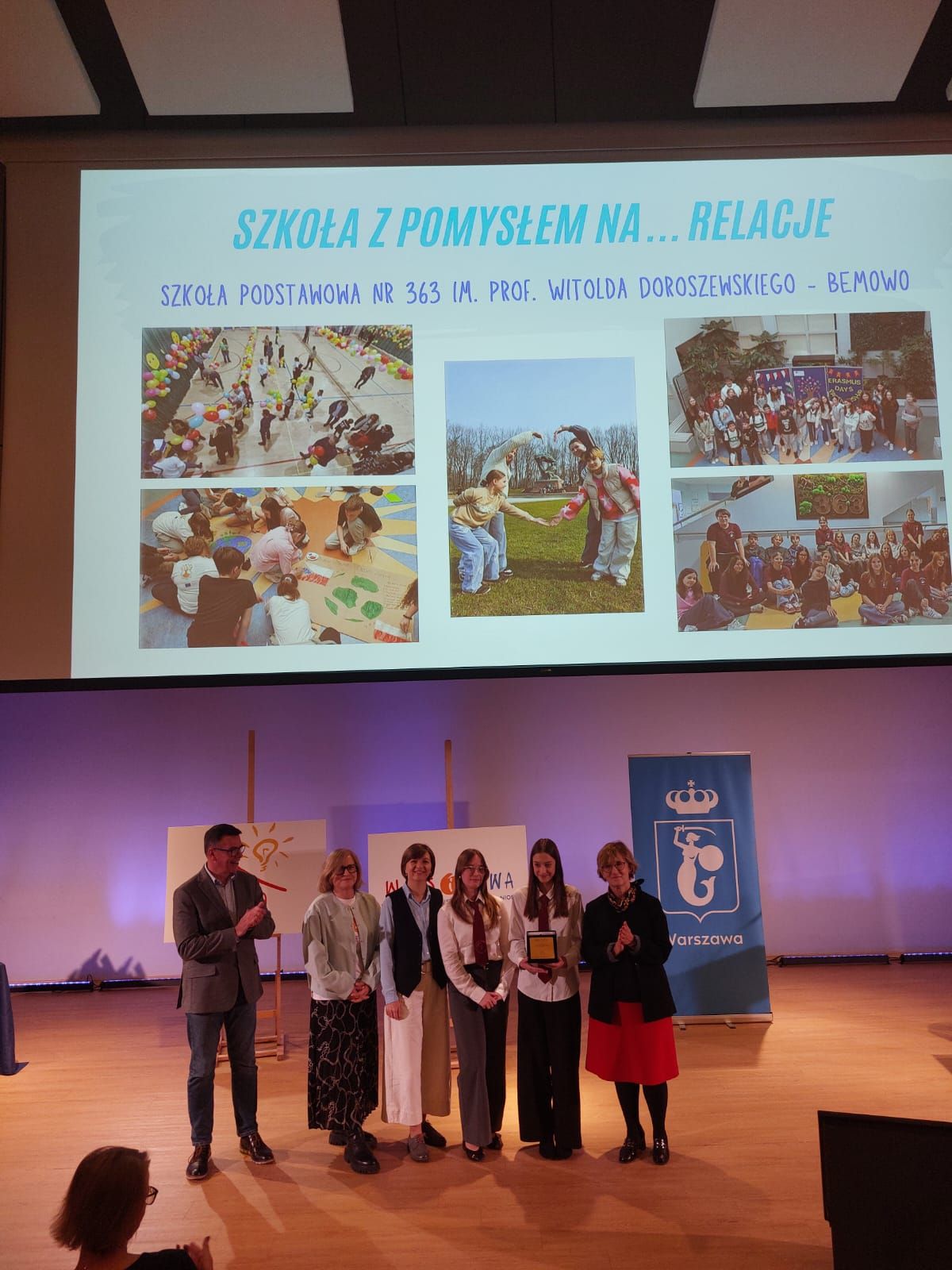 Nagrodę podczas uroczystej gali w Centrum Nauki Kopernik odebrała Pani Dyrektor wraz z Panią Wicedyrektor oraz przedstawicielkami Samorządu Uczniowskiego.